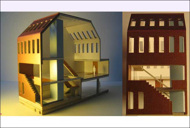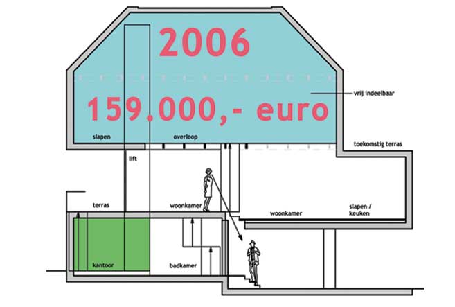 Groei-woning Het idee is simpel, het casco met alle buitengevels worden gebouwd volgens het maximaal te bouwen bouwvolume. De meegroei variant is duidelijk gebaseerd op het budget. Het volledige volume is niet te bouwen voor 167.300,- euro maar kost 185.200,- euro. Dus twee vloeren worden nu niet gebouwd. De prijs voor dit vooorstel is dan ook 159.000,- euro. Het huis is zeer luxe en heeft een lift. Hierdoor is het huis te bewonen gedurende het hele leven. Natuurlijk is de woning ook zeer geschikt voor de minder valide mens. Het huis is eenvoudig intern te verbouwen. Door twee vloeren inclusief alle binnenwanden later te bouwen wanneer de portemonee het toelaat is dit voorstel te realiseren. Het voordeel is dat de doe-het-zelver geen angst hoeft te hebben om groot te moeten verbouwen, alleen intern. Houten balken, vloerdelen en extra geluidsisolatie door middel van zwevende plafonds zijn eenvoudig te plaatsen. Ook kunnen delen worden afgesplitst met eigen entree zodat privacy blijft gewaarborgd. Te denken valt aan buitenlandse gasten, inwonende ouders, jonge startende stellen, die graag de zolder bewonen en bijvoorbeeld studenten. Daarmee komt het meegroei huis tot stand. |